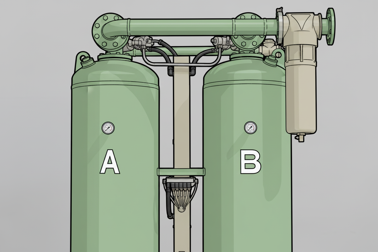 Twin Towers (Vessels): Two chambers filled with desiccant material. While one tower dries the compressed air, the other regenerates by releasing moisture.